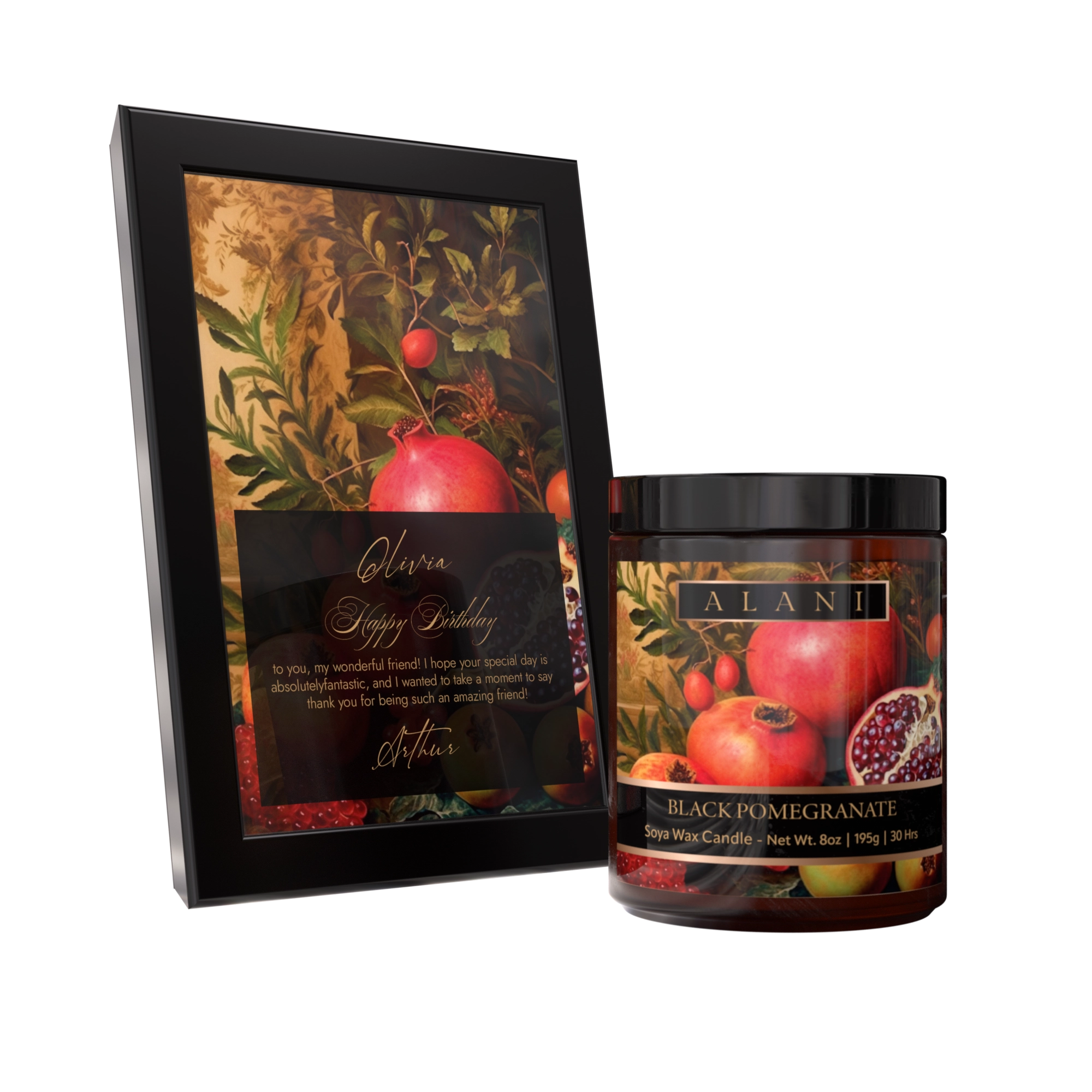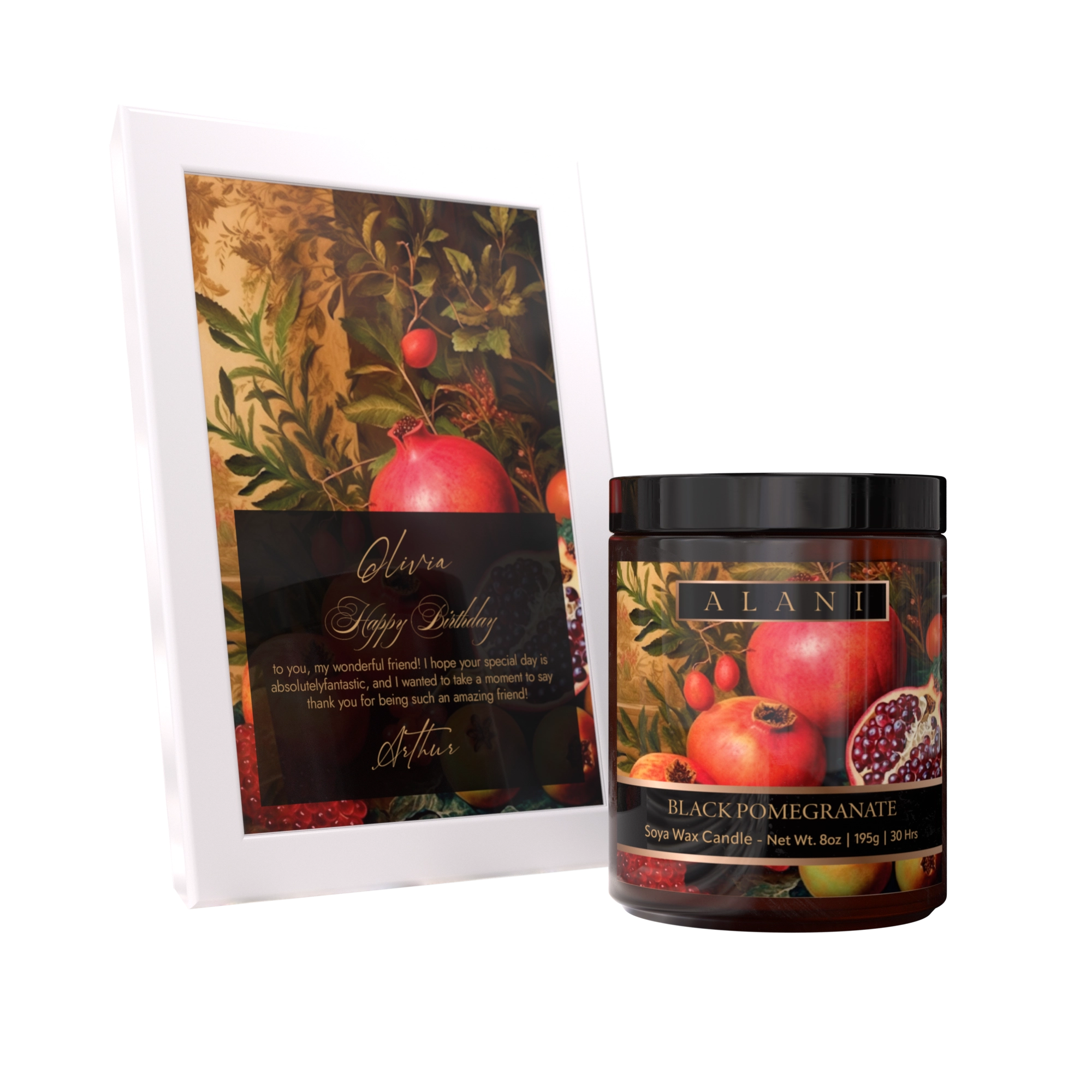 Ignite your senses with our Black Pomegranate scented candle. Experience the allure of juicy pomegranate blended with velvety undertones. Let this captivating fragrance fill your space with mystery and sophistication. Crafted with high-quality ingredients, this candle offers a clean and long-lasting burn, enveloping you in its seductive aroma. Elevate your ambience with the captivating essence of Black Pomegranate.