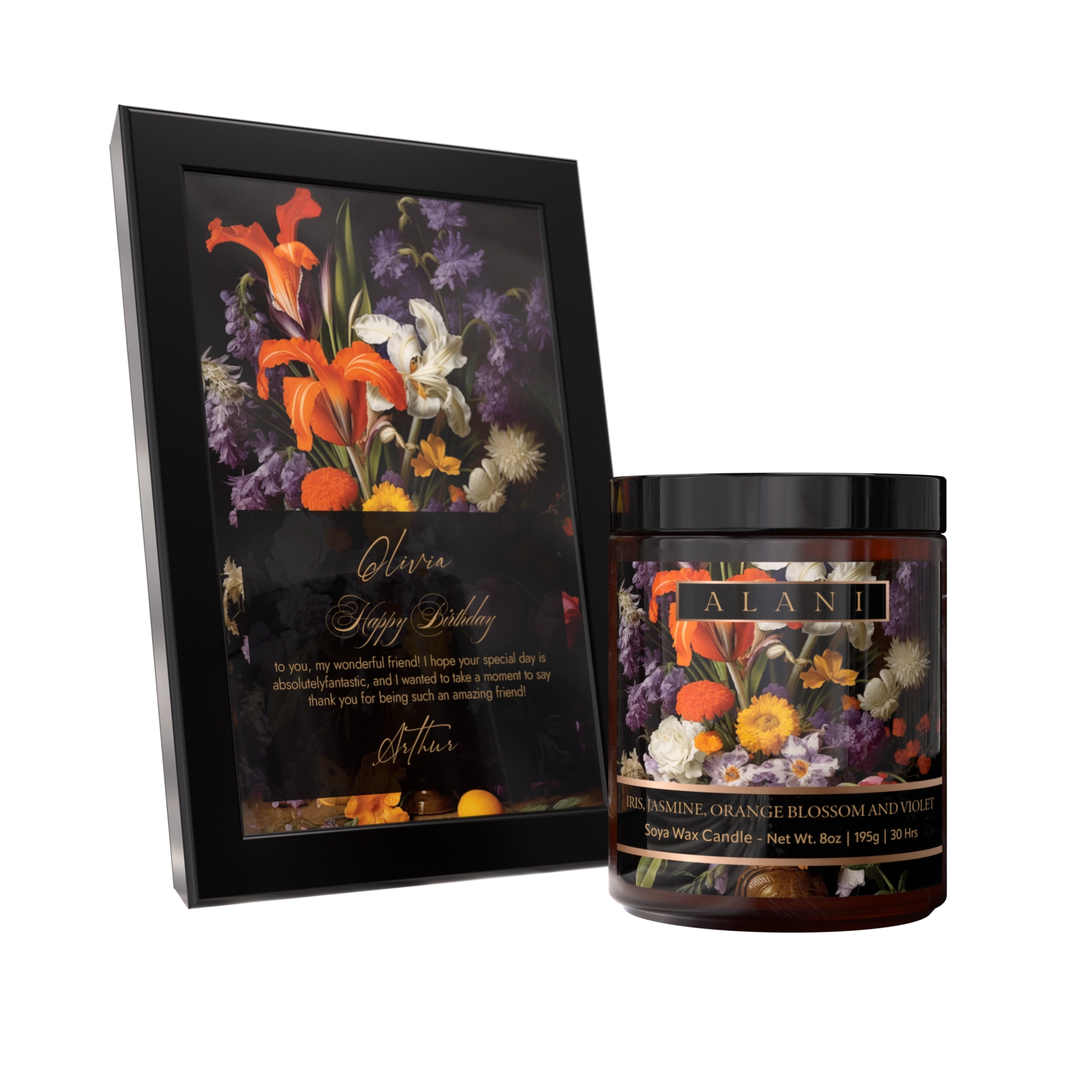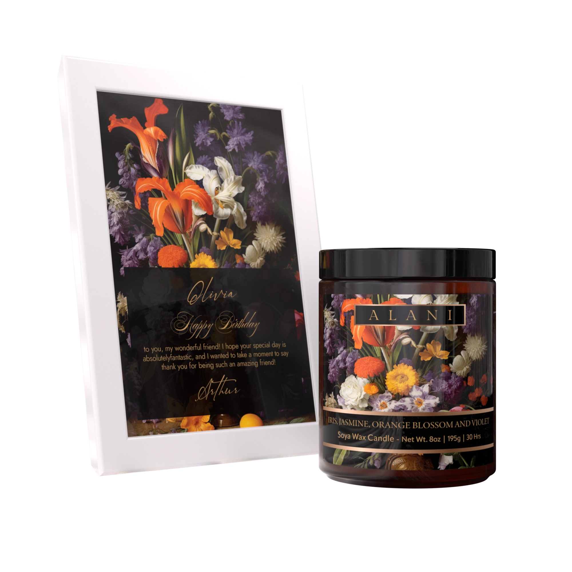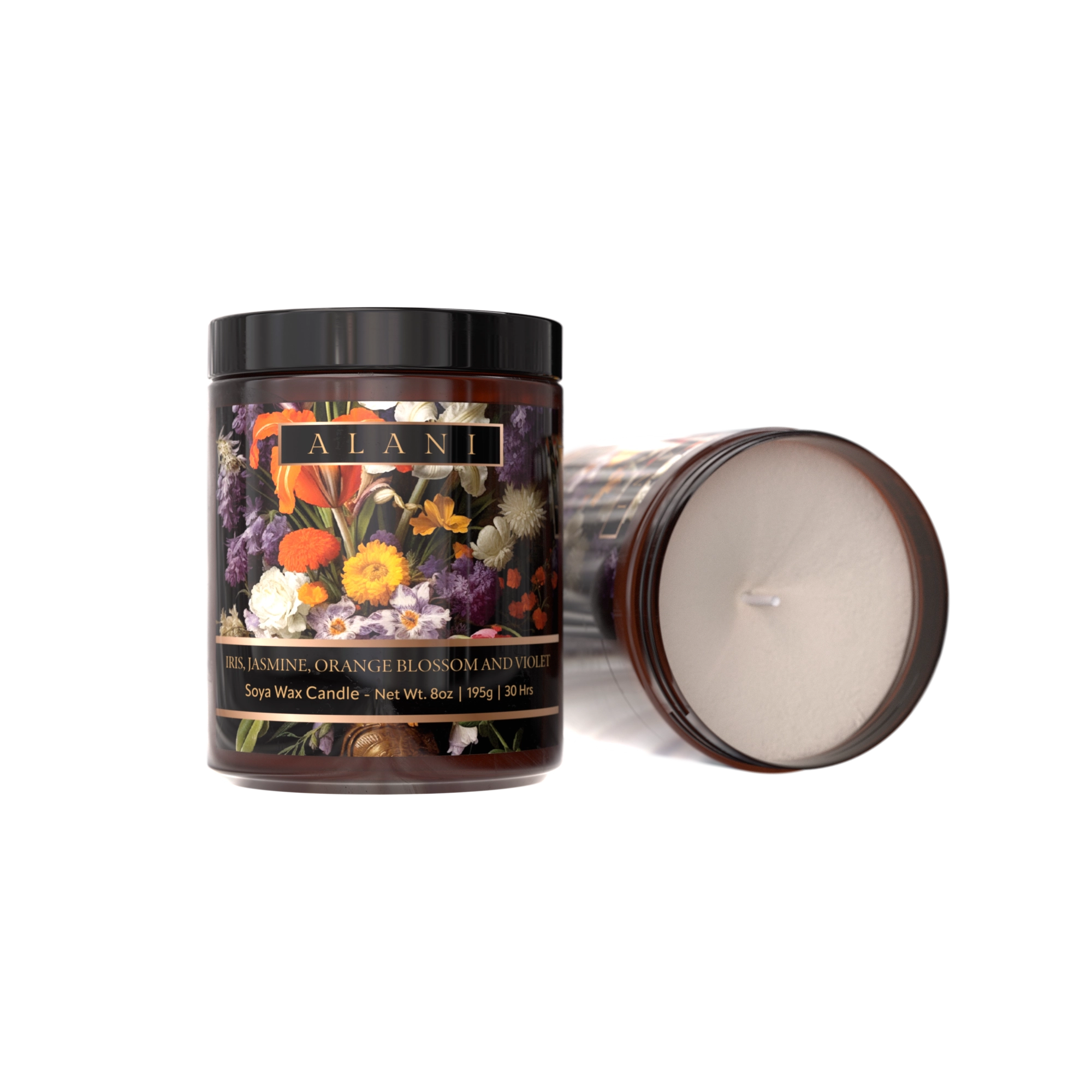 Immerse yourself in the captivating blend of Iris, Jasmine, Orange Blossom, and Violet with our scented candle. Experience the sophisticated elegance of Iris, the romantic allure of Jasmine, the delicate sweetness of Orange Blossom, and the vibrant charm of Violet. Crafted with premium ingredients, this candle offers a clean and long-lasting burn, enveloping your space with a multi-dimensional floral fragrance. Elevate your ambience with the enchanting essence of this exquisite blend.